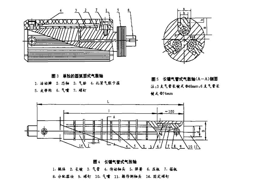 圓弧形金屬板)氣脹袖(圖3)是一種門幅較窄的氣動(dòng)的芯管夾具,應(yīng)用已有40 年的歷史,代替機(jī)械頂緊頭。它可以單獨(dú)或幾組組合起來串套在一支方軸或日軸上使用,從圖中知,單獨(dú)的其結(jié)構(gòu)為一支短的芯軸,軸心鉆有通氣孔并配有氣嘴,中間部分套有一橡膠氣胎.艙兩端緊緊扎在軸的中間部分兩端,以防漏氣。膠胎外側(cè)為一組活動(dòng)的弧形板,通常為4~6 塊,由鋁臺(tái)金制成。在長(zhǎng)度方向表面銑有細(xì)紋,增加與接觸紙芯管內(nèi)壁之間的摩擦力,兩端鉆有沉頭螺孔,用內(nèi)六角螺釘與軸芯連接·并留有一定活動(dòng)(徑向)余量。一旦通氣,橡膠胎膨脹,頂起活動(dòng)弧形板,把外馨的芯管牢牢撐住.軸端連接方法可以是法蘭、皮帶輪及其它。